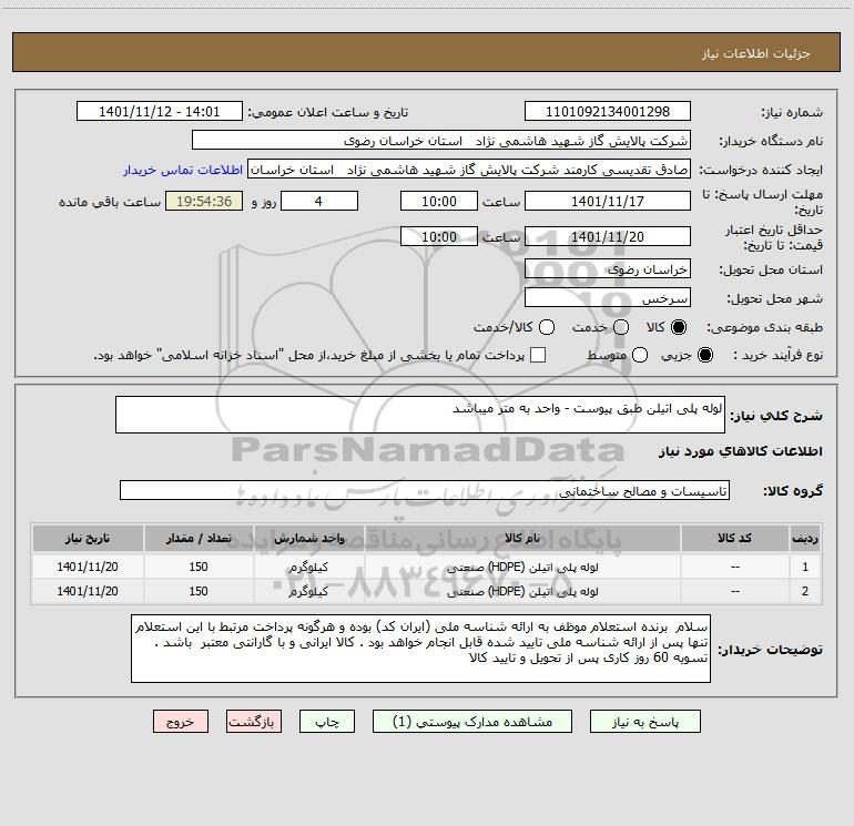 نام دستگاه خریدار:شرکت پالایش گاز شهید هاشمی نژاد استان خراسان رضوی