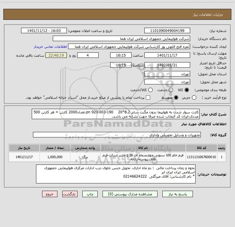 شرح کلی نیاز: کارت سوار شدن به هواپیما بدون مگنت سایز 8.2*20 190-003-920 pn،تعداد2000 کارتن = هر کارتن 500 عددی،ایران کد انتخاب شده صرفا جهت تشابه می باشد.