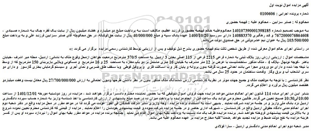 در راستای اجرای حکم اموال معرفی شده از طریق شخص ثالث بنام فهیمه حضوری بشرح ذیل توقیف و پس از ارزیابی توسط کارشناس رسمی مزایده برگزار می گردد :»