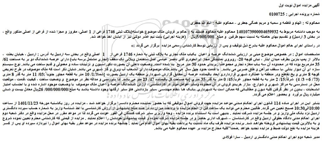 ، به موجب دادنامه مربوط به 1401073900004659932 محکوم علیه محکوم هستند به : حکم بر فروش ملک موضوع خواسته(پلاک ثبتی 1746 فرعی از 1 اصلی، مفروز و مجزا شده از فرعی از اصلی مذکور واقع در بخش 3 اردبیل) و تقسیم بهای حاصله به نسبت سهم طرفین و مبلغ 5/000/000ریال (هزینه اجرایی) بابت نیم عشر دولتی نیز از ایشان اخذ خواهد شد.