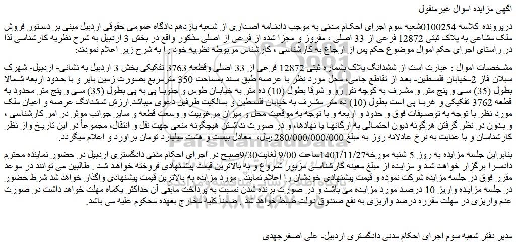 درپرونده کلاسه 0100254شعبه سوم اجرای احکام مدنی به موجب دادنامه اصداری از شعبه یازدهم دادگاه عمومی حقوقی اردبیل مبنی بر دستور فروش ملک مشاعی به پلاک ثبتی 12872 فرعی از 33 اصلی ، مفروز و مجزا شده از فرعی از اصلی مذکور واقع در بخش 3 اردبیل به شرح نظریه کارشناسی لذا در راستای اجرای حکم اموال موضوع حکم پس از ارجاع به کارشناسی ، کارشناس مربوطه نظریه خود را به شرح زیر اعلام نمودند:
