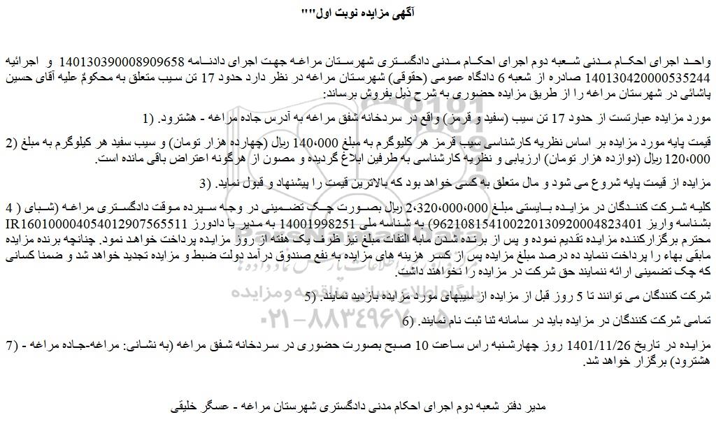 واحد اجرای احکام مدنی شعبه دوم اجرای احکام مدنی دادگستری شهرستان مراغه جهت اجرای دادنامه 140130390008909658 و اجرائیه 140130420000535244 صادره از شعبه 6 دادگاه عمومی (حقوقی) شهرستان مراغه در نظر دارد حدود 17 تن سیب متعلق به محکومٌ علیه آقای حسین پاشائی در شهرستان مراغه را از طریق مزایده حضوری به شرح ذیل بفروش برساند: