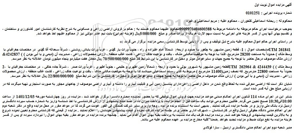 مشخصات اموال : 1- قطعه زمین مشهور به چلغور با حدود و اربعه: شمالاً امام علیزاده و راه ، جنوباً وراث یار محمدی ، غرباً وراث باباش روشنی ، شرقاً سعداله آقا محمدی در مختصات جغرافیای با UTM 261841 &4242837 ( وسط ملک ) حدوداً به مساحت 28200 مترمربع، فلذا با توجه به موقعیت مکانی ملک ، بافت و نوعیت خاک زراعی ، کشت غالب منطقه ، ارزش محصولات زراعی ، مدیریت آن (دیمی و یا آبی بودن ) ارزش ملک موصوف درحال حاضر با توجه به جمیع جهات و سایرعوامل موثر و دخیل در کارشناسی با این شرایط کلاً مبلغ 70/500/000/000 ریال معادل هفت میلیاردو پنجاه میلیون تومان عادلانه به نظر میرسد.