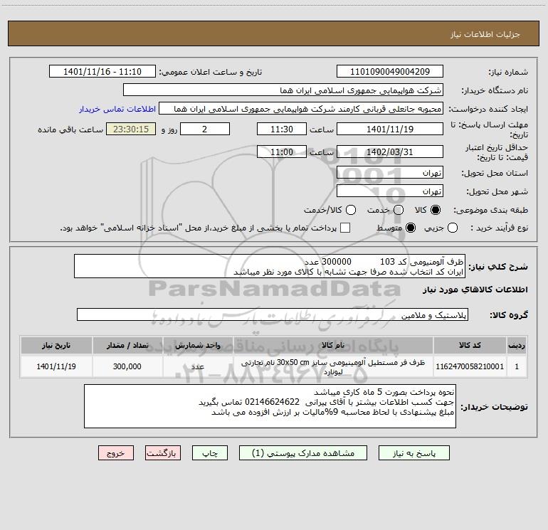 شرح کلی نیاز: ظرف آلومنیومی کد 103 300000 عدد ایران کد انتخاب شده صرفا جهت تشابه با کالای مورد نظر میباشد