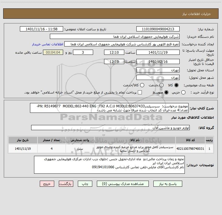 شرح کلی نیاز: موضوع درخواست: سرسیلندرPN: R5149877 MODEL:802-440 ENG :T92 A.C.U MODLE:80637433- تعداد:4 عدد-ایران کد انتخاب شده صرفا جهت تشابه می باشد-