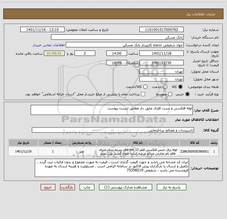 شرح کلی نیاز: لوله فلکسی و بست فلزی عایق دار مطابق لیست پیوست