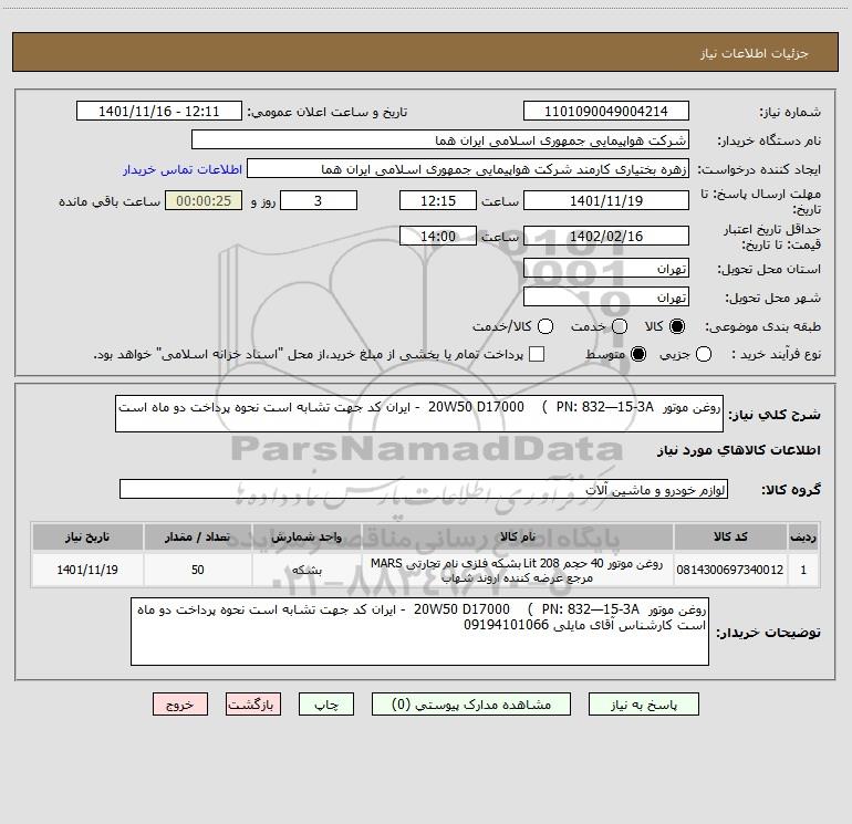 شرح کلی نیاز: روغن موتور 20W50 D17000 ( PN: 832—15-3A - ایران کد جهت تشابه است نحوه پرداخت دو ماه است