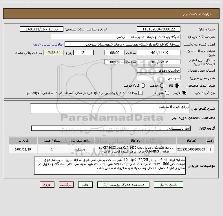 شرح کلی نیاز: ژنراتور دیزل 6 سیلندر