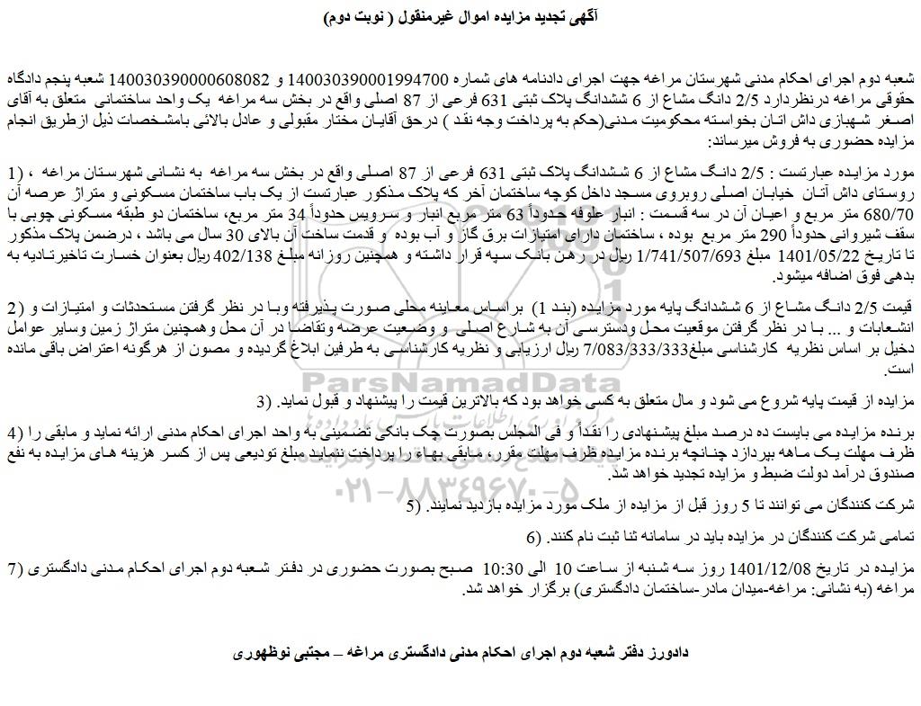 شعبه دوم اجرای احکام مدنی شهرستان مراغه جهت اجرای دادنامه های شماره 140030390001994700 و 140030390000608082 شعبه پنجم دادگاه حقوقی مراغه درنظردارد 2/5 دانگ مشاع از 6 ششدانگ پلاک ثبتی 631 فرعی از 87 اصلی واقع در بخش سه مراغه یک واحد ساختمانی متعلق به آقای اصغر شهبازی داش اتان بخواسته محکومیت مدنی(حکم به پرداخت وجه نقد ) درحق آقایان مختار مقبولی و عادل بالائی بامشخصات ذیل ازطریق انجام مزایده حضوری به فروش میرساند: