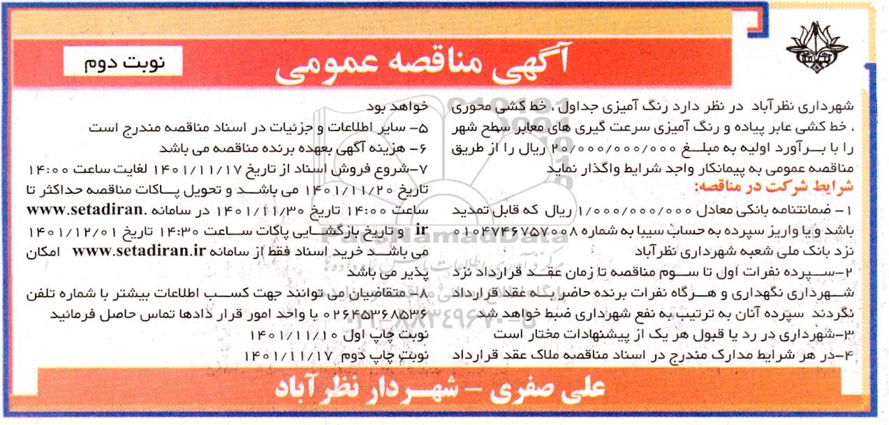 شهرداری نظرآباد در نظر دارد رنگ آمیزی جداول، خط کشی محوری، خط کشی عابر پیاده و رنگ آمیزی سرعت گیری های معابر سطح شهر را با برآورد اولیه به مبلغ 20.000.000.000 ریال را از طریق مناقصه عمومی به پیمانکار واجد شرایط واگذار نماید.
