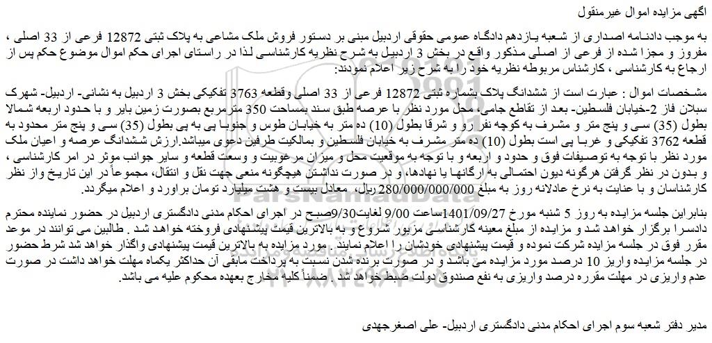 به موجب دادنامه اصداری از شعبه یازدهم دادگاه عمومی حقوقی اردبیل مبنی بر دستور فروش ملک مشاعی به پلاک ثبتی 12872 فرعی از 33 اصلی ، مفروز و مجزا شده از فرعی از اصلی مذکور واقع در بخش 3 اردبیل به شرح نظریه کارشناسی لذا در راستای اجرای حکم اموال موضوع حکم پس از ارجاع به کارشناسی ، کارشناس مربوطه نظریه خود را به شرح زیر اعلام نمودند: