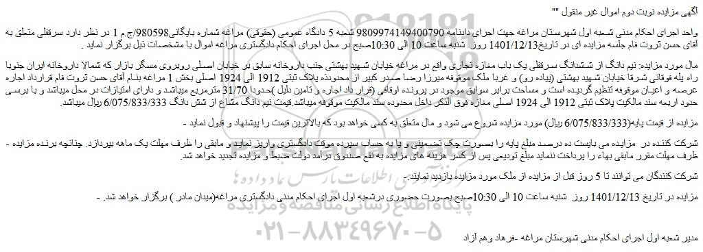 "آگهی مزایده نوبت دوم اموال غیر منقول "