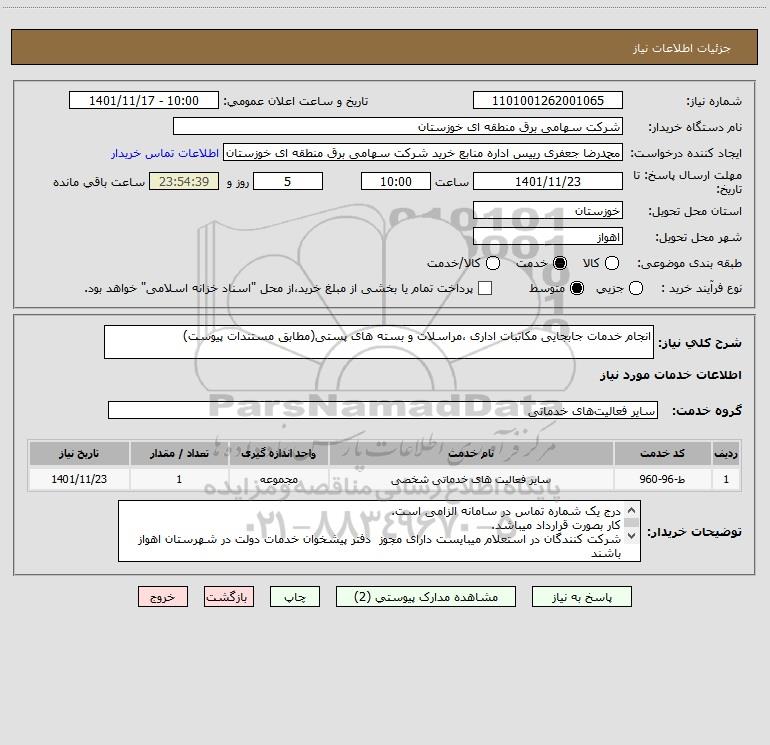 شرح کلی نیاز: انجام خدمات جابجایی مکاتبات اداری ،مراسلات و بسته های پستی(مطابق مستندات پیوست)