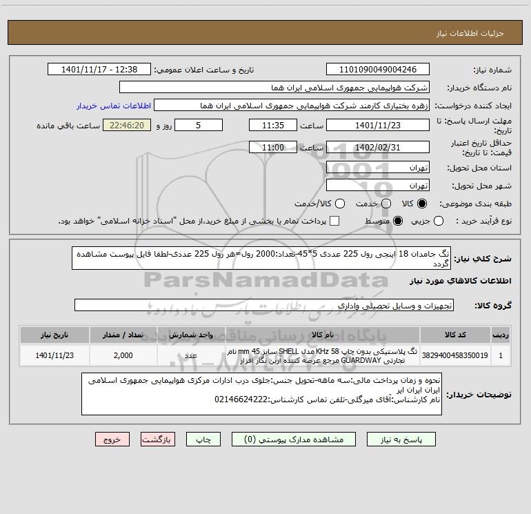 شرح کلی نیاز: تگ جامدان 18 اینجی رول 225 عددی 5*45-تعداد:2000 رول=هر رول 225 عددی-لطفا فایل پیوست مشاهده گردد