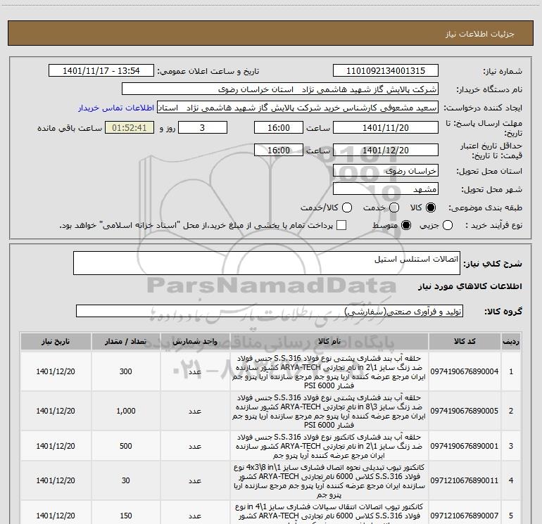 نام دستگاه خریدار:شرکت پالایش گاز شهید هاشمی نژاد استان خراسان رضوی