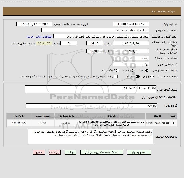 توضیحات خریدار:ایرانکد مشابه میباشد-پرداخت 3ماهه میباشد-برگ فنی و مالی پیوست گردد-تحویل بوشهر انبار فلات قاره هزینه به عهده فروشنده میباشد-عدم الحاق برگ فنی به منزله انصراف میباشد.