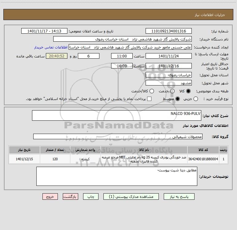 شرح کلی نیاز: NALCO 936-PULV