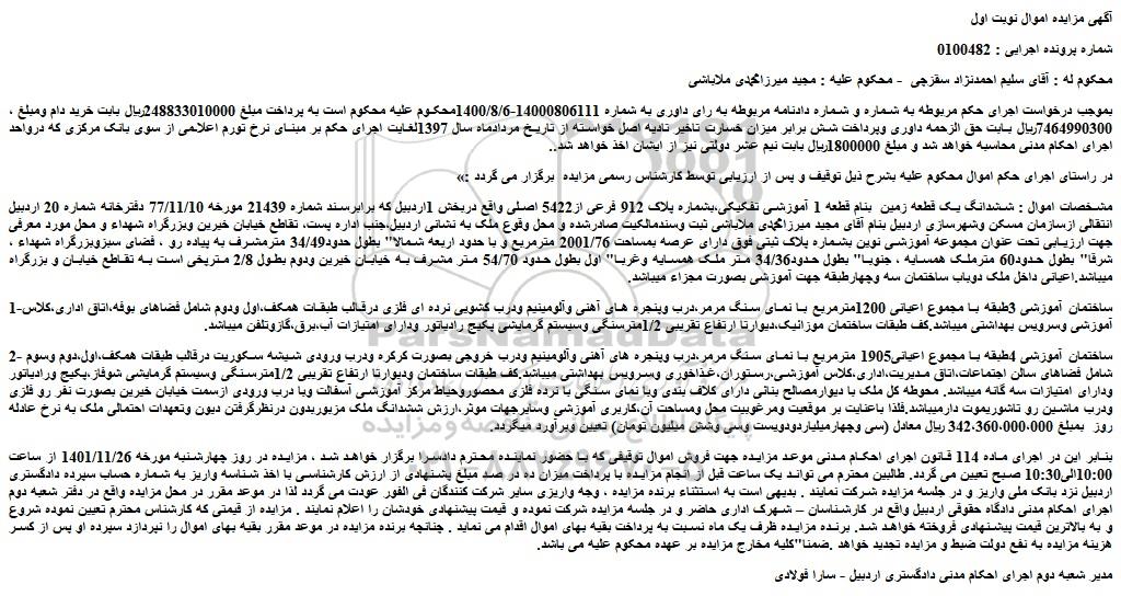 مشخصات اموال : ششدانگ یک قطعه زمین بنام قطعه 1 آموزشی تفکیکی،بشماره پلاک 912 فرعی از5422 اصلی واقع دربخش 1اردبیل که برابرسند شماره 21439 مورخه 77/11/10 دفترخانه شماره 20 اردبیل انتقالی ازسازمان مسکن وشهرسازی اردبیل بنام آقای مجید میرزامحمدی ملاباشی ثبت وسندمالکیت صادرشده و محل وقوع ملک به نشانی اردبیل،جنب اداره پست، تقاطع خیابان خیرین وبزرگراه شهداء و محل مورد معرفی جهت ارزیابی تحت عنوان مجموعه آموزشی نوین بشماره پلاک ثبتی فوق دارای عرصه بمساحت 2001/76 مترمربع و با حدود اربعه شمالا" بطول حدود34/49 مترمشرف به پیاده رو ، فضای سبزوبزرگراه شهداء ، شرقا" بطول حدود60 مترملک همسایه ، جنوبا" بطول حدود34/36 متر ملک همسایه وغربا" اول بطول حدود 54/70 متر مشرف به خیابان خیرین ودوم بطول 2/8 مترپخی است به تقاطع خیابان و بزرگراه میباشد.اعیانی داخل ملک دوباب ساختمان سه وچهارطبقه جهت آموزشی بصورت مجزاء میباشد.