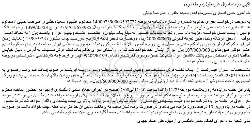 به موجب درخواست اجرای حکم به شماره و شماره دادنامه مربوطه 140007390003592722 محکوم علیهم ( سعیده خلفی و علیرضا جلیلی ) محکوم هستند به پرداخت تضامنی مبلغ دو میلیاردو صدو چهل میلیون ریال از بابت چک شماره سریال 9704/673985 به تاریخ 1399/05/23 برعهده بانک قوامین ازبابت اصل خواسته ،هزینه دادرسی و تعرفه خدمات قضایی به مبلغ یک میلیون و هفتصدو هشتاد وچهار هزارو پانصد ریال ( به لحاظ اعسار موقت... ) ،حق الوکاله وکیل طبق تعرفه قانونی (20/000/000 ریال ) وخسارت تاخیر تادیه ازتاریخ سررسید چک مذکور (1399/5/23 ) لغایت زمان اجرای حکم که ازطریق اجرای احکام مدنی بر مبنای نرخ تورم شاخص سالانه بانک مرکزی دولت جمهوری اسلامی ایران محاسبه ودرحق محکوم له. نیم عشر دولتی طبق قانون 107/000/000 ریال  نیز از ایشان اخذ خواهد شد لذا در راستای اجرای حکم یک تخته فرش دستباف به آدرس اردبیل خیابان حافظ16متری امیدنبش سوم پلاک 89امین اموال بنام محمد حسن موسوی فخرشماره تماس 09920290199پس از ارجاع به کارشناسی ، کارشناس مربوطه نظریه خود را به شرح زیر اعلام نمودند: