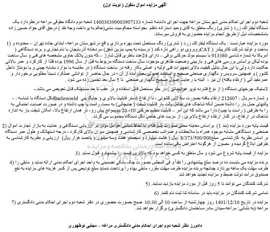 شعبه دوم اجرای احکام مدنی شهرستان مراغه جهت اجرای دادنامه شماره 140030390003907133 شعبه دوم دادگاه حقوقی مراغه درنظردارد یک دستگاه لیفتراک زرد ( شتری) رنگ متعلق به آقای وحید اسدزاده ناظم بخواسته محکومیت مدنی(حکم به پرداخت وجه نقد ) درحق آقای جواد حسین زاده بامشخصات ذیل ازطریق انجام مزایده حضوری به فروش میرساند: