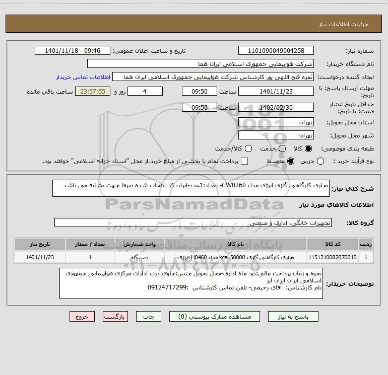 شرح کلی نیاز: بخاری کارگاهی گازی انرژی مدل GW0260- تعداد:1عدد-ایران کد انتخاب شده صرفا جهت تشابه می باشد