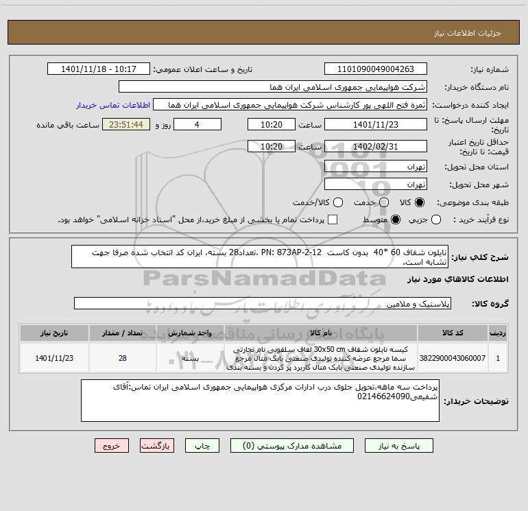 شرح کلی نیاز: نایلون شفاف 60 *40 بدون کاست PN: 873AP-2-12 ،تعداد28 بسته، ایران کد انتخاب شده صرفا جهت تشابه است.