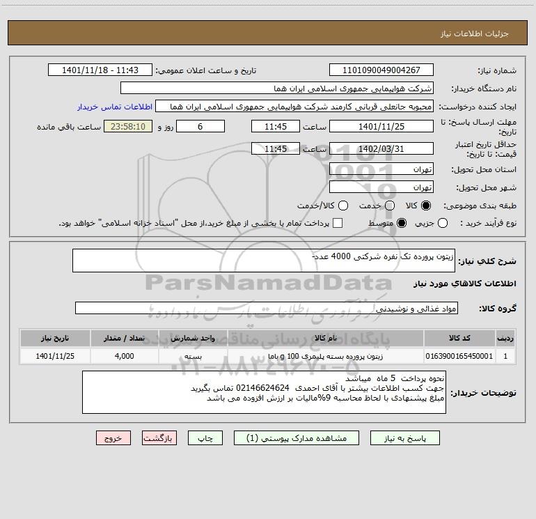 شرح کلی نیاز: زیتون پرورده تک نفره شرکتی 4000 عدد-