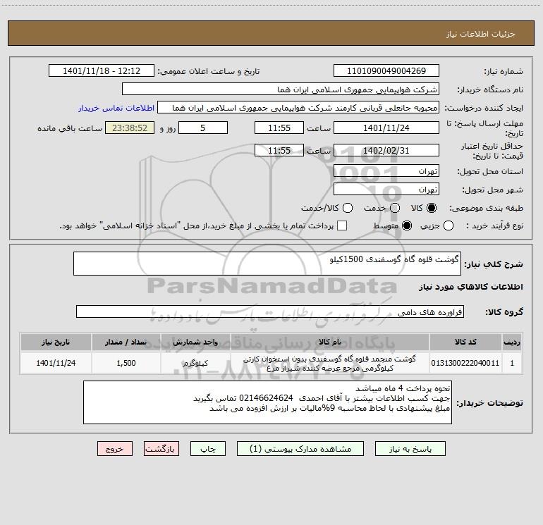 شرح کلی نیاز: گوشت قلوه گاه گوسفندی 1500کیلو
