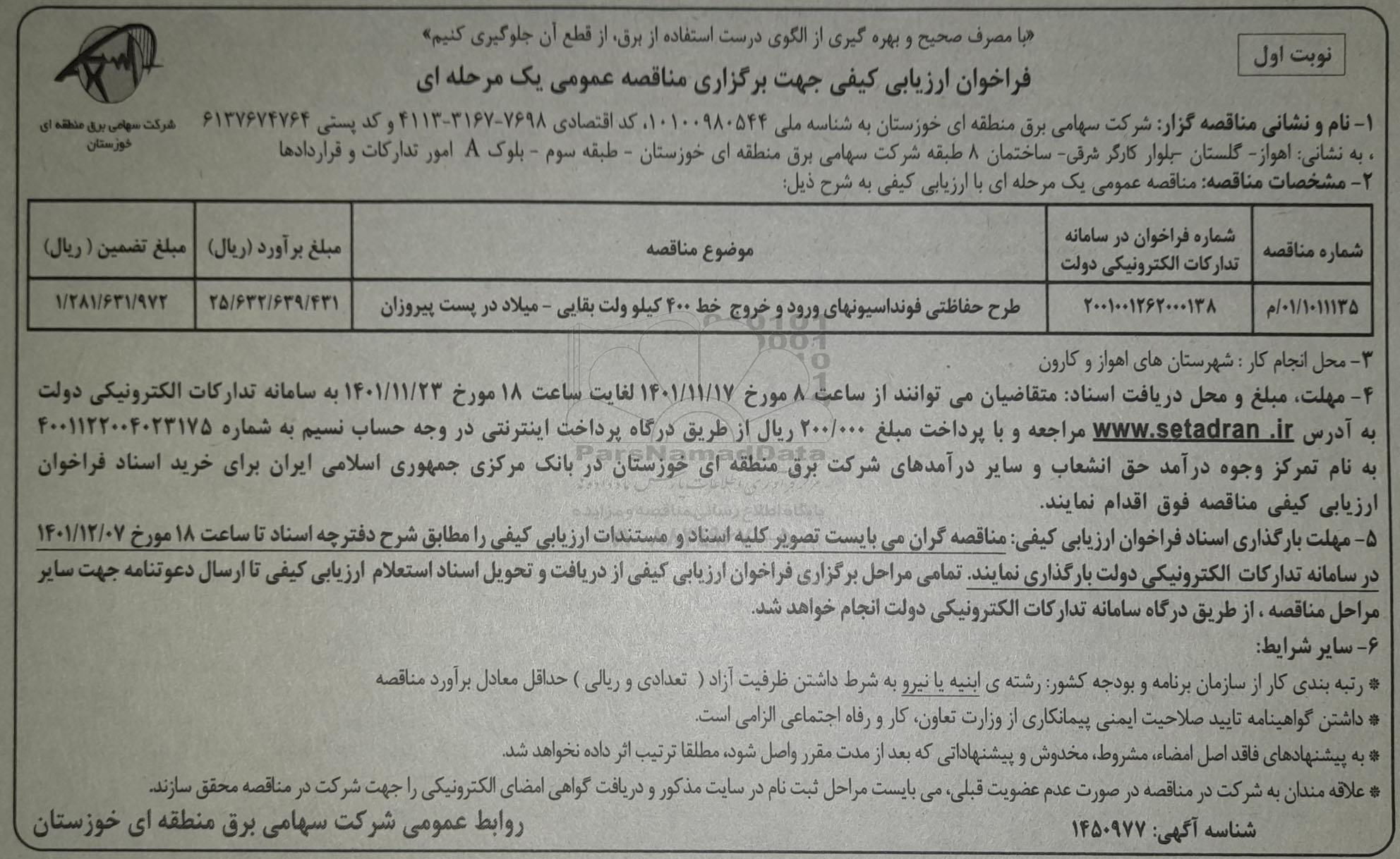 1. نام و نشانی مناقصه گزار: شرکت سهامی برق منطقه ای خوزستان به شناسه ملی 10100980544 کد اقتصادی 7698 - 3167 - 4113 و کدپستی 6137674764 به نشانی اهواز، گلستان بلوار کارگر شرقی، ساختمان 8 طبقه شرکت سهامی برق منطقه ای خوزستان، طبقه سوم، بلوک A امور تدارکات و قراردادها