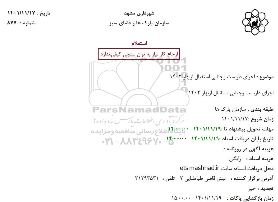 استعلام بها و موضوع استعلام استعلام اجرای داربست و چتایی استقبال از بهار 1401 به اطلاع کلیه شرکتها و افراد متخصص واجد شرایط میرساند، آگهی گذار در نظر دارد از طریق استعلام بها، نسبت به انتخاب و دریافت پیشنهادات اقدام نماید. این استعلام با کد آگهی ثبت شده در سامانه خبرگزاری پارس نماد : 5491379 منتشر شده است. مشخصات استعلام : تاریخ شروع استعلام: 1401/11/18 آخرین مهلت ارسال پیشنهاد قیمت : 1401/11/19 و محل اجرای پروژه : استان خراسان رضوی میباشد. استعلام قیمت مورد درخواست : استعلام اجرای داربست و چتایی استقبال از بهار 1401 با دستهبندیهای تخصصی و گروه های مرتبط : تجهیزات پارک و مبلمان شهری, داربست های فلزی, ساختمان, استعلام اطلاع رسانی میگردد. شرایط شرکت در استعلام آنلاین : ابتدا ثبت نام در سامانه استعلام پارس نماد و تکمیل مدارک موردنیاز و بارگذاری در سامانه رعایت تمامی ضوابط و الزامات مندرج در اسناد استعلام است.