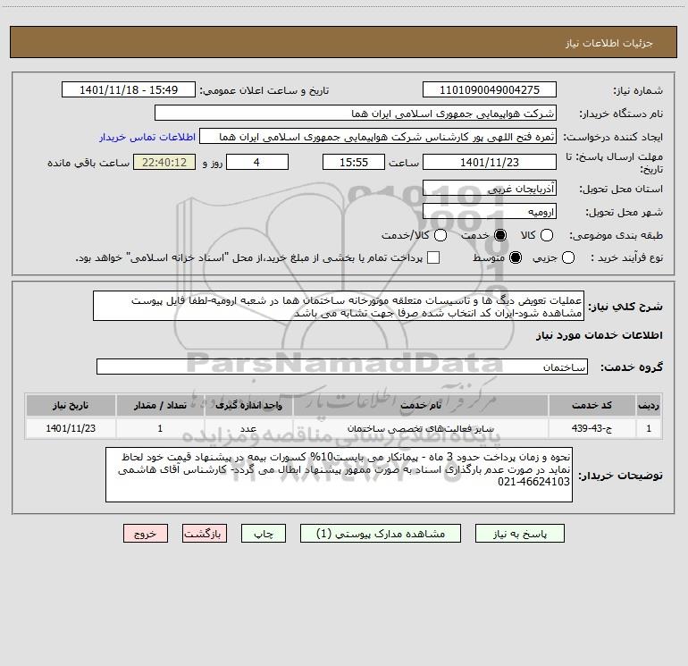 شرح کلی نیاز: عملیات تعویض دیگ ها و تاسیسات متعلقه موتورخانه ساختمان هما در شعبه ارومیه-لطفا فایل پیوست مشاهده شود-ایران کد انتخاب شده صرفا جهت تشابه می باشد