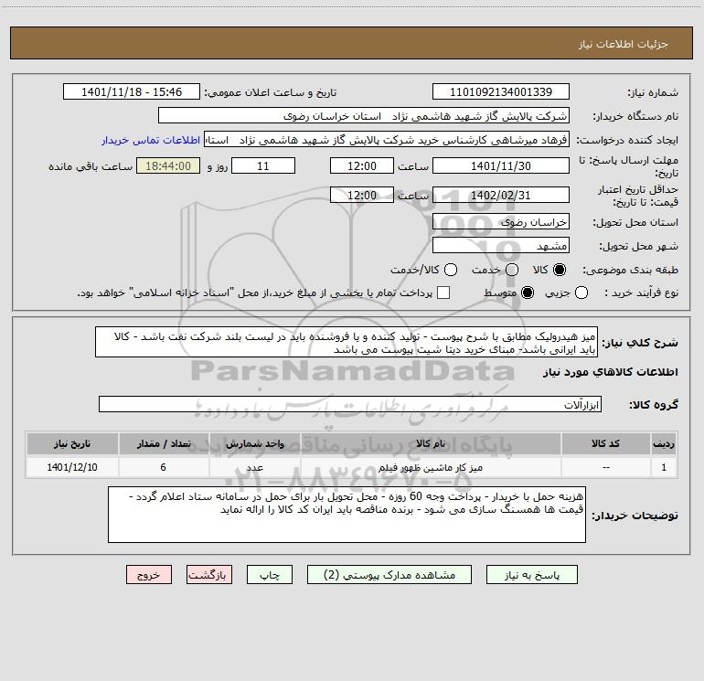 نام دستگاه خریدار:شرکت پالایش گاز شهید هاشمی نژاد استان خراسان رضوی