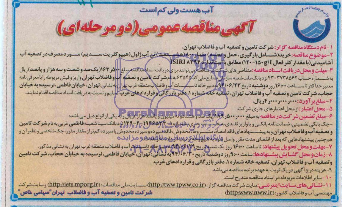 موضوع مناقصه: خرید (شامل بارگیری، حمل و تخلیه) مقدار 800 (هشتصد) تن آب ژاول (هیپو کلریت سدیم) مورد مصرف در تصفیه آب آشامیدنی (با مقدار کلر فعال 150-120 g/I مطابق با استاندارد ISIRI 8394