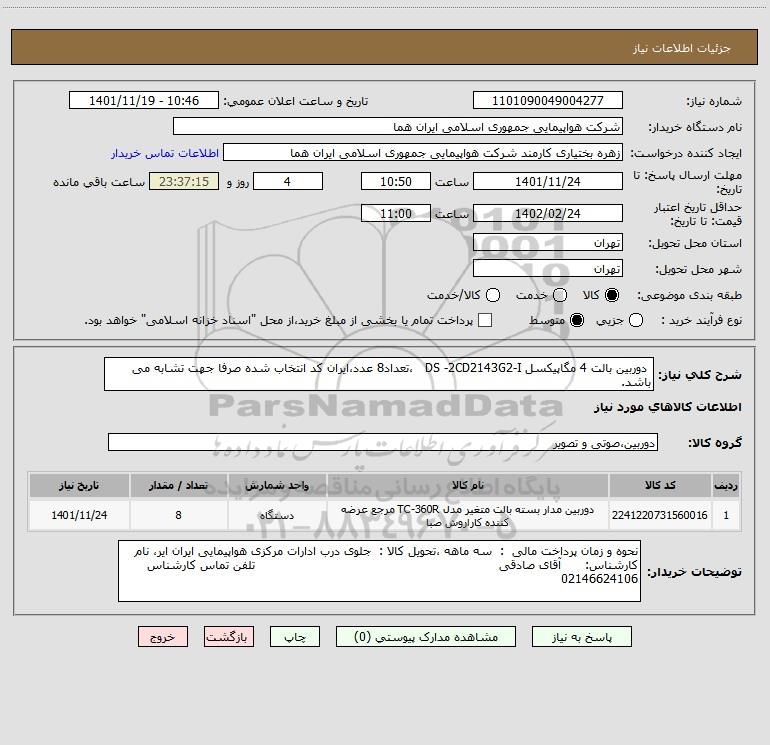 شرح کلی نیاز: دوربین بالت 4 مگاپیکسل DS -2CD2143G2-I ،تعداد8 عدد،ایران کد انتخاب شده صرفا جهت تشابه می باشد.