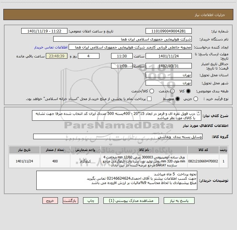 شرح کلی نیاز: درب فویل نقره ای و قرمز در ابعاد 15*20 - 400بسته 500 عددی ایران کد انتخاب شده صرفا جهت تشابه با کالای مورد نظر میباشد