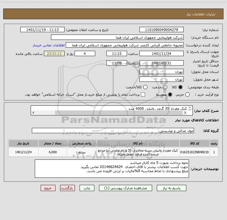 شرح کلی نیاز: کیک مغزدار 35 گرمی وانیلی 4000 عدد
