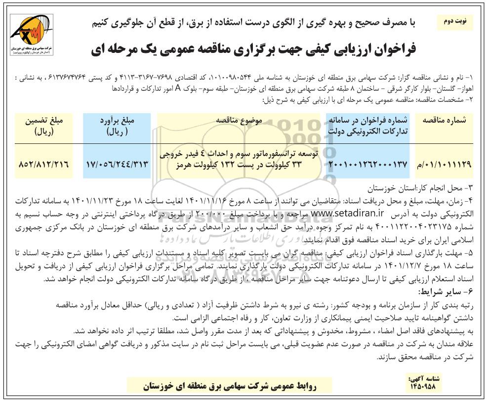1. نام و نشانی مناقصه گزار: شرکت سهامی برق منطقه ای خوزستان به شناسه ملی 10100980544 کد اقتصادی 7698 - 3167 - 4113 و کدپستی 6137674764 به نشانی اهواز، گلستان بلوار کارگر شرقی، ساختمان 8 طبقه شرکت سهامی برق منطقه ای خوزستان، طبقه سوم، بلوک A امور تدارکات و قراردادها