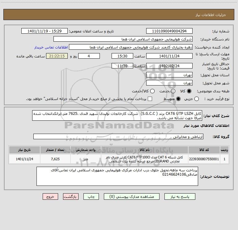 شرح کلی نیاز: کابل CAT6 UTP LSZH برند ( S.G.C.C) شرکت کارخانجات تولیدی شهید قندی ،7625 متر،ایرانکدانتخاب شده صرفا جهت تشابه می باشد.