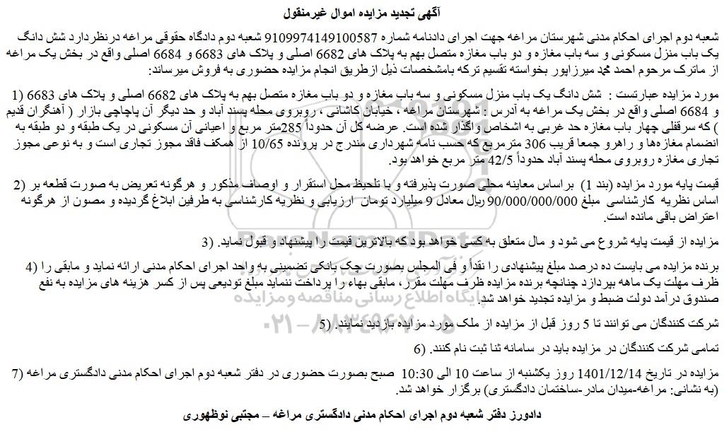 شعبه دوم اجرای احکام مدنی شهرستان مراغه جهت اجرای دادنامه شماره 9109974149100587 شعبه دوم دادگاه حقوقی مراغه درنظردارد شش دانگ یک باب منزل مسکونی و سه باب مغازه و دو باب مغازه متصل بهم به پلاک های 6682 اصلی و پلاک های 6683 و 6684 اصلی واقع در بخش یک مراغه از ماترک مرحوم احمد محمد میرزاپور بخواسته تقسیم ترکه بامشخصات ذیل ازطریق انجام مزایده حضوری به فروش میرساند: