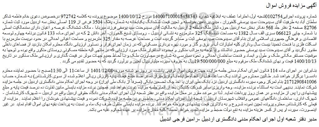 شماره پرونده اجرایی0102754شعبه اول-احتراما عطف به ابلاغیه شماره 140007100015458343 مورخ 1400/10/12 موضوع پرونده به کلاسه 972742 درخصوص دعوی خانم فاطمه شاکر سلطان آباد به طرفیت آقای سیدوحدت سید یوسفی کلخوران ، مبنی بر تامین خواسته و تعیین قیمت ششدانگ یکبابخانه به شماره پلاک 3504 فرعی از 119 اصلی بخش سه اردبیل مورد ثبت شماره 82706 صفحه 2 دفتر جلد 568 دفاتر بخش سه اردبیل حوزه ثبتی ملک منطقه 2 اردبیل به مالکیت آقای سیدوحدت سید یوسفی فرزند میربابا ، مالک ششدانگ عرصه و اعیان دارای سندمالکیت اصلی با شماره چاپی 066123 سری الف سال 1382 به مساحت ششدانگ 325 مترمربع به نشانی اردبیل - روستای شیخ کلخوران- آخر دانش 2 که در اجرای ماده 133 قانون برنامه چهارم توسعه اقتصادی و فرهنگی جمهوری اسلامی ایران بنام آقای سیدوحدت سید یوسفی ثبت و صادر گردیده است و مساحت عرصه به مقدار 325 مترمربع و مساحت اعیانی احداثی در حدود دویست مترمربع با اسکلت فلزی با قدمت تخمینا بیست سال ودارای کلیه امتیازات آب و برق و گاز و مورد بهره برداری مسکونی که در زمان اجرای قرار و دستور ارزیابی دادگاه محترم امکان بازدید از فضاهای داخلی مقدور نگردید و آقای سیدوحدت سید یوسفی حضور نداشتند و با توجه به مراتب مذکور و محدوده استقرار ملک مورد ارزیابی که در منتهی الیه منطقه مسکونی روستای مذکور واقع بوده و توجها به موقعیت مستقر مکانی ملک و طول و ابعاد و قدمت ساختمان احداثی و نحوه دسترسی به شارع در مجاورت ملک و با لحاظ جمیع جهات موثر در قیمت گذاری و ارزیابی ملک مذکور در تاریخ 1400/10/13 قیمت و بهای ششدانگ ملک مرقوم به مبلغ 19/500/000/000ریال به حروف سیزده میلیاردریال تعیین و برآورد گردید که به حضور تقدیم می گردد .