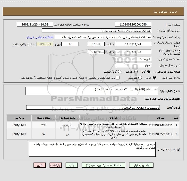 شرح کلی نیاز: 1- سیمان (200 پاکت) 2- ماسه شسته (36 متر)