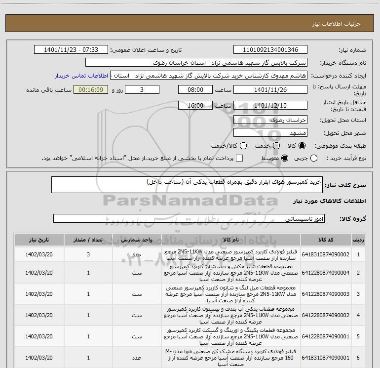 نام دستگاه خریدار:شرکت پالایش گاز شهید هاشمی نژاد استان خراسان رضوی