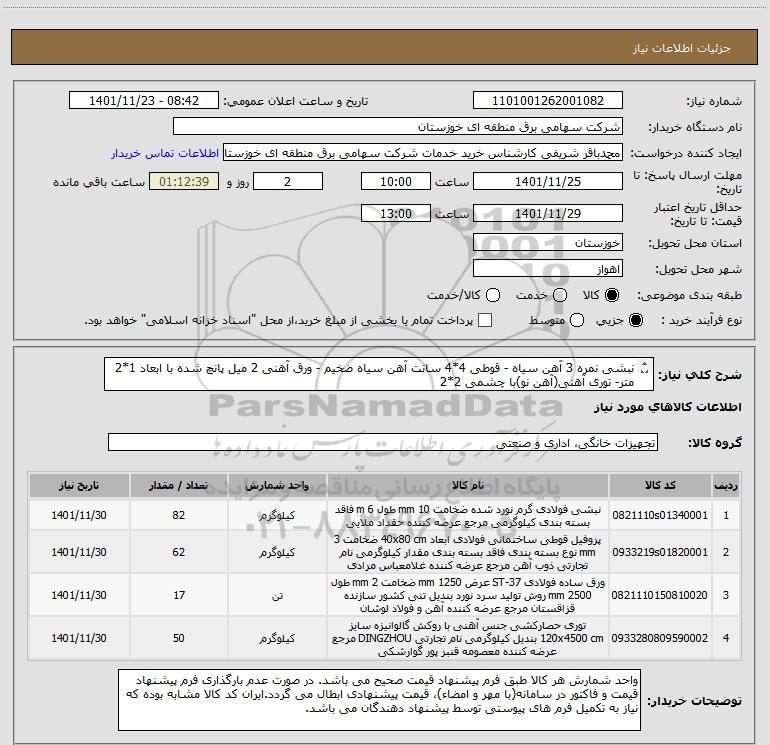 | 1 | 0821110s01340001 | نبشی فولادی گرم نورد شده ضخامت 10 mm طول 6 m فاقد بسته بندی کیلوگرمی مرجع عرضه کننده حقداد ملایی | کیلوگرم | 82 | 1401/11/30 |
