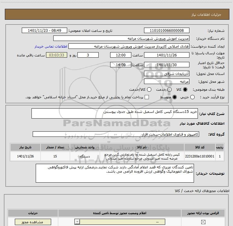 شرح کلی نیاز: خرید 15دستگاه کیس کامل اسمبل شده طبق جدول پیوستی