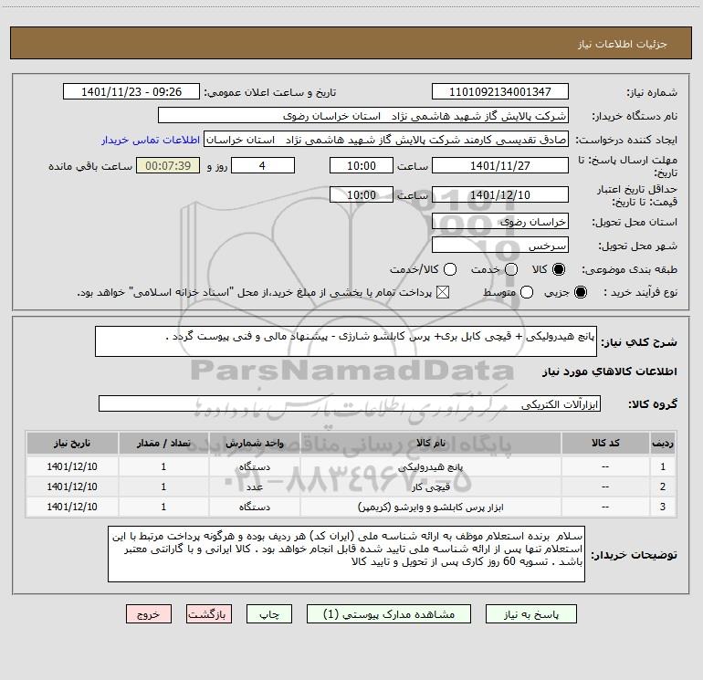 نام دستگاه خریدار:شرکت پالایش گاز شهید هاشمی نژاد استان خراسان رضوی