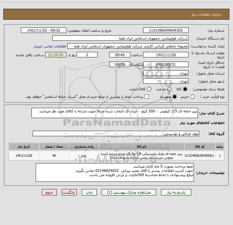 شرح کلی نیاز: پنیر خامه ای 1/5 کیلویی - 200 کیلو - ایران کد انتخاب شده صرفا جهت تشابه با کالای مورد نظر میباشد