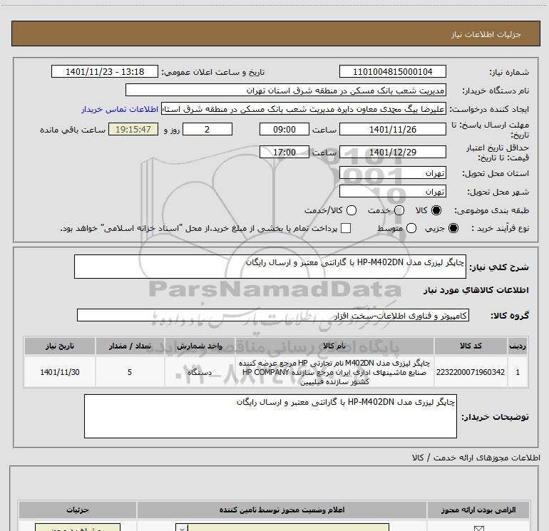 شرح کلی نیاز: چاپگر لیزری مدل HP-M402DN با گارانتی معتبر و ارسال رایگان