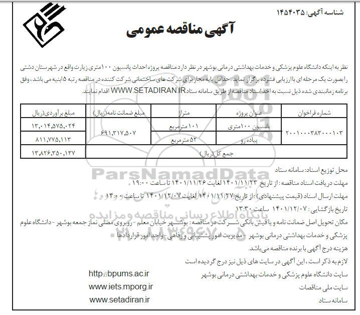 نظر به اینکه دانشگاه علوم پزشکی و خدمات بهداشتی درمانی بوشهر در نظر دارد مناقصه پروژه احداث پانسیون 100 متری زیارت واقع در شهرستان دشتی را بصورت یک مرحله ای با ارزیابی فشرده برگزار نماید. حداقل پایه مجاز برای شرکت های ساختمانی شرکت کننده در مناقصه رتبه 5 ابنیه می باشد. وفق برنامه زمانبندی شده ذیل نسبت به اخذ اسناد مناقصه را از طریق سامانه ستاد اقدام نمایند.