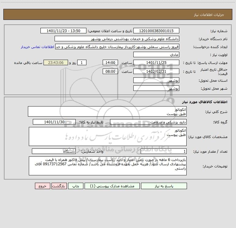 نام دستگاه خریدار:دانشگاه علوم پزشکی و خدمات بهداشتی درمانی بوشهر