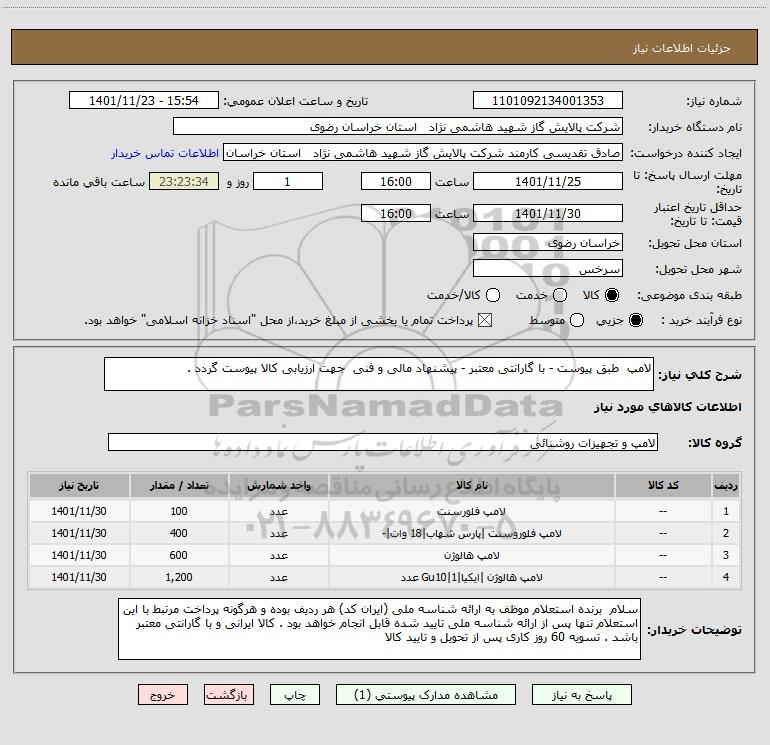 نام دستگاه خریدار:شرکت پالایش گاز شهید هاشمی نژاد استان خراسان رضوی